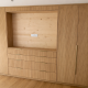 Aménagement en Normandie d'un meuble sur-mesure sous escalier. À la fois un gain de place pour vos rangements et en même temps un éléments décoratifs grâce aux niches ouvertes.
